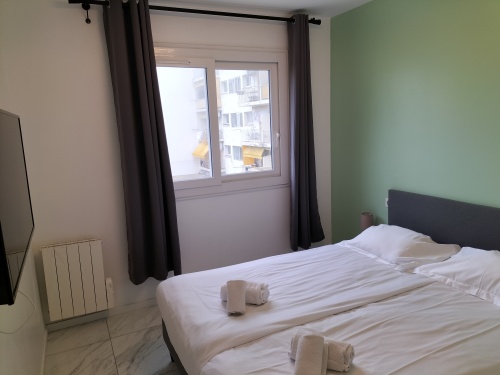 Cet appartement de 63m2 pouvant accueillir 8 personnes offre un bel espace dans la pièce de vie principale et une vue sur la ville depuis le petit balcon
