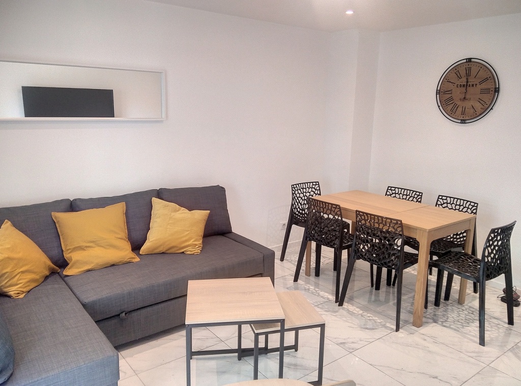 Le salon/salle à manger est équipé d'un canapé lit 2 places, table à manger, chaises, TV HD, wifi,