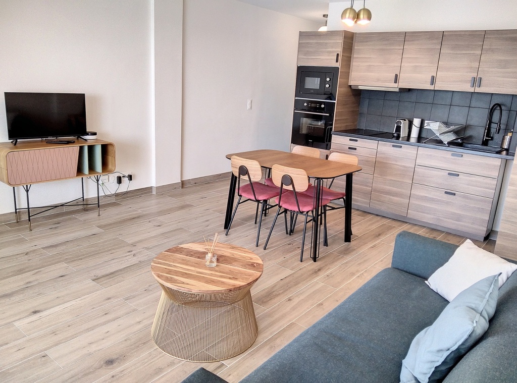Le salon/salle à manger est équipé d'un canapé lit 2 places, table et chaises, rangements TV, Wifi, Climatisation, et d'une cuisine entièrement équipée.