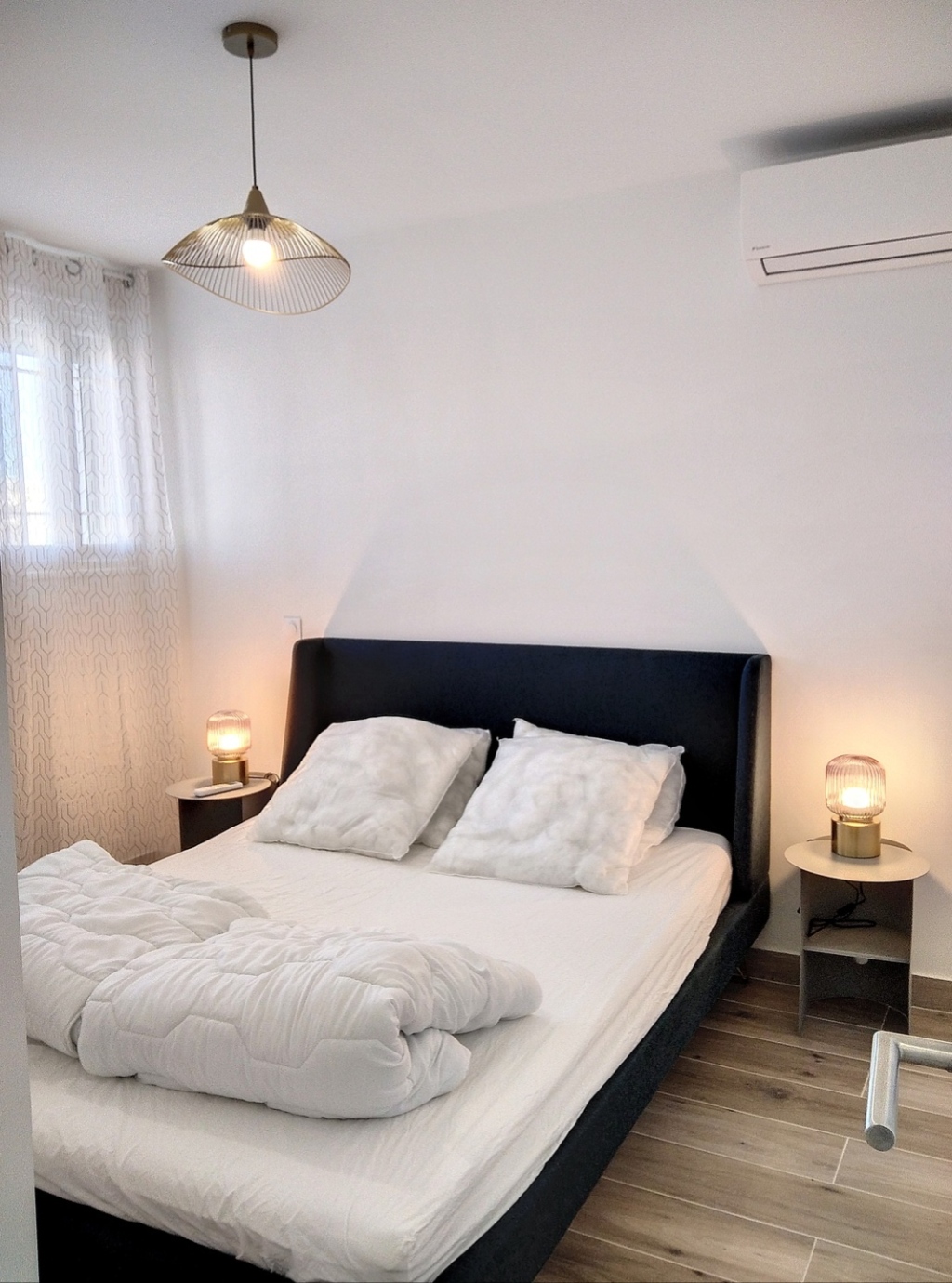 Il y a un lit double dans la chambre, ainsi qu'un espace de rangement et la climatisation.