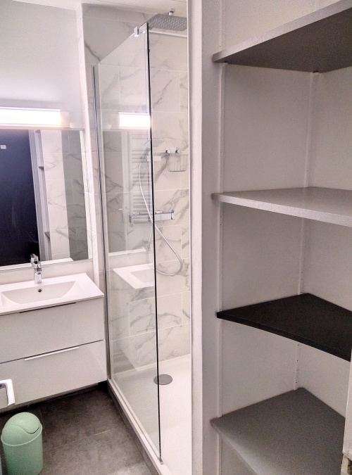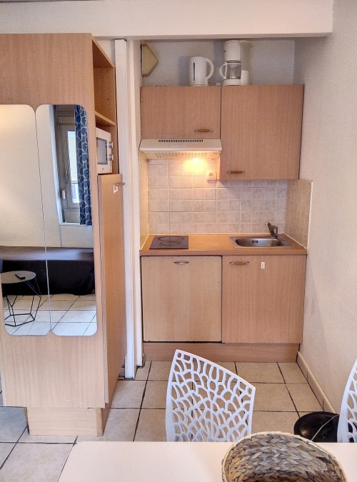 Le studio compte 4 couchages Le salon/salle à manger est équipé de 2 lits simples qui peuvent former un lit double et de lits superposés dans l’entrée. Vous trouverez également une kitchenette équipée de plaques de cuisson, micro ondes, réfrigérateur et tout le nécessaire pour cuisiner. Dans l’entrée, vous trouverez…