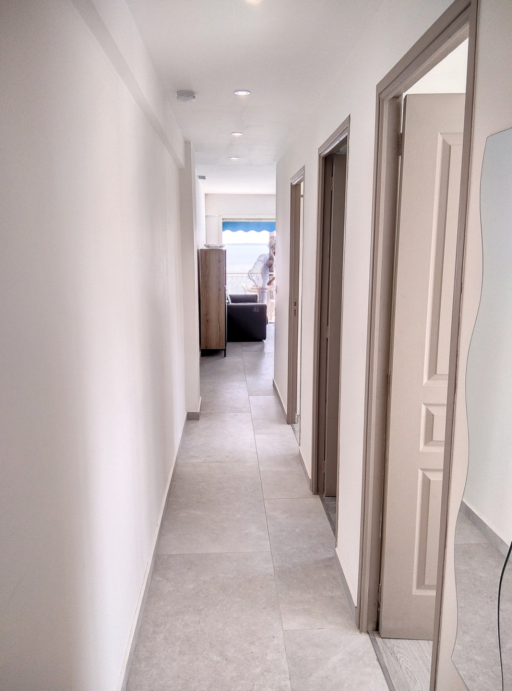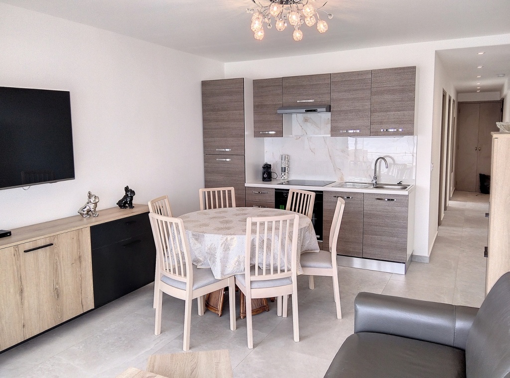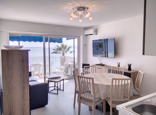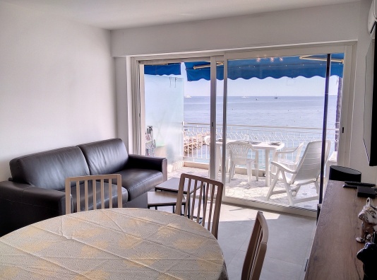 Cet appartement de 46 m2 rénové offre un bel espace dans la pièce de vie principale et offre une vue dégagée du Cap d'Antibes à Cannes.