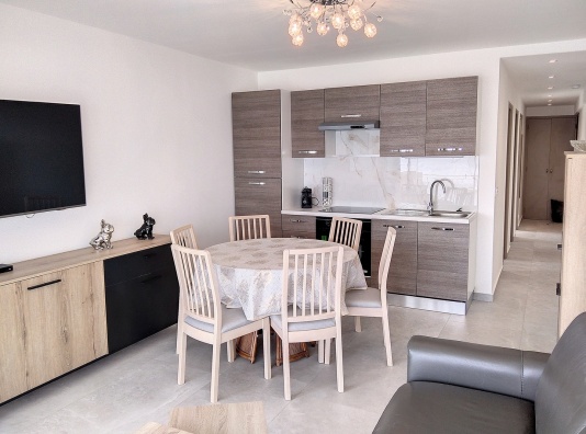 Le salon/salle à manger est équipé d'un canapé lit 2 places, table et chaises, rangements TV, Wifi, Climatisation, et s'ouvre sur une cuisine entièrement équipée.