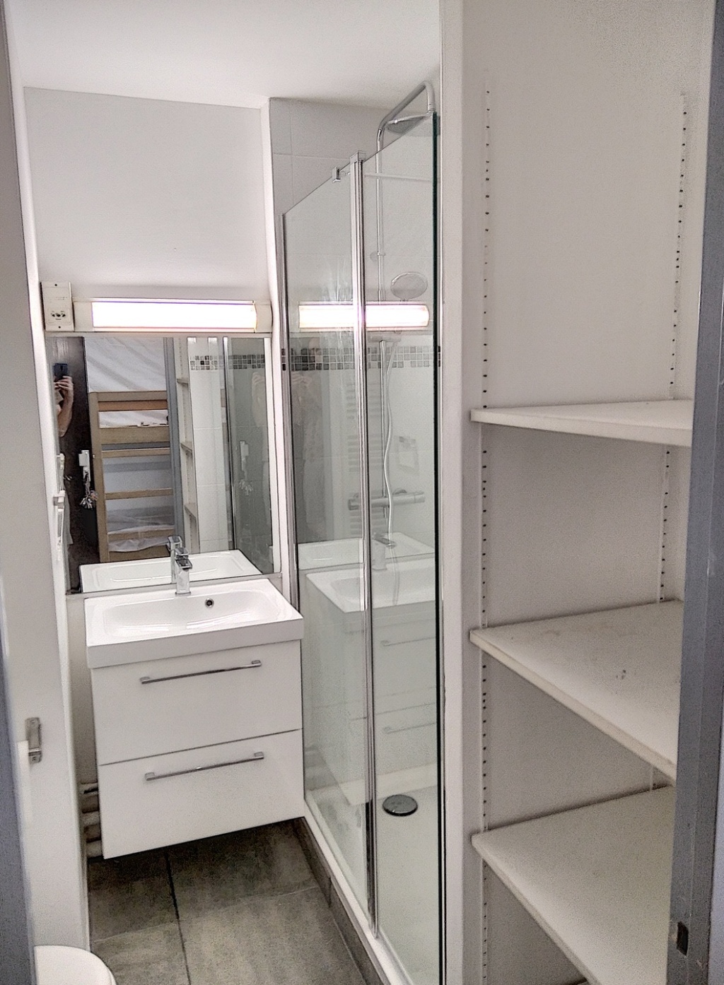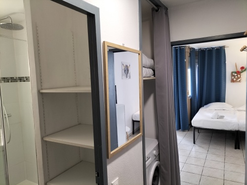Le studio compte 4 couchages Le salon/salle à manger est équipé de 2 lits simples qui peuvent former un lit double et de lits superposés dans l’entrée. Vous trouverez également une kitchenette équipée de plaques de cuisson, micro ondes, réfrigérateur et tout le nécéssaire pour cuisiner. Dans l’entrée, vous trouverez…
