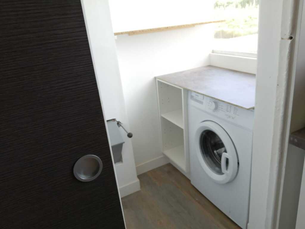 Há uma lavanderia com máquina de lavar e todo o material de limpeza necessário.