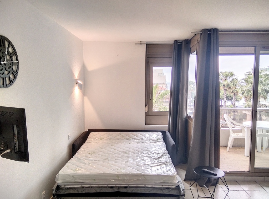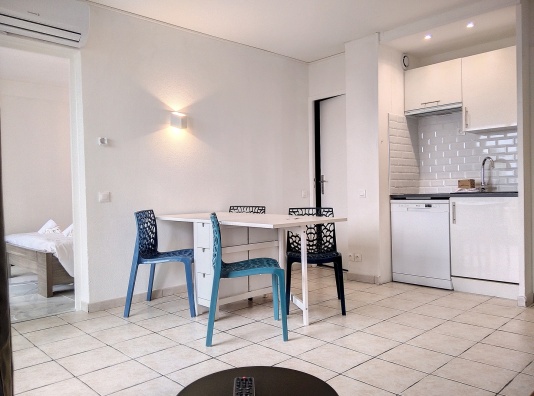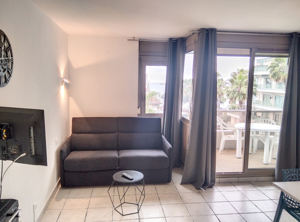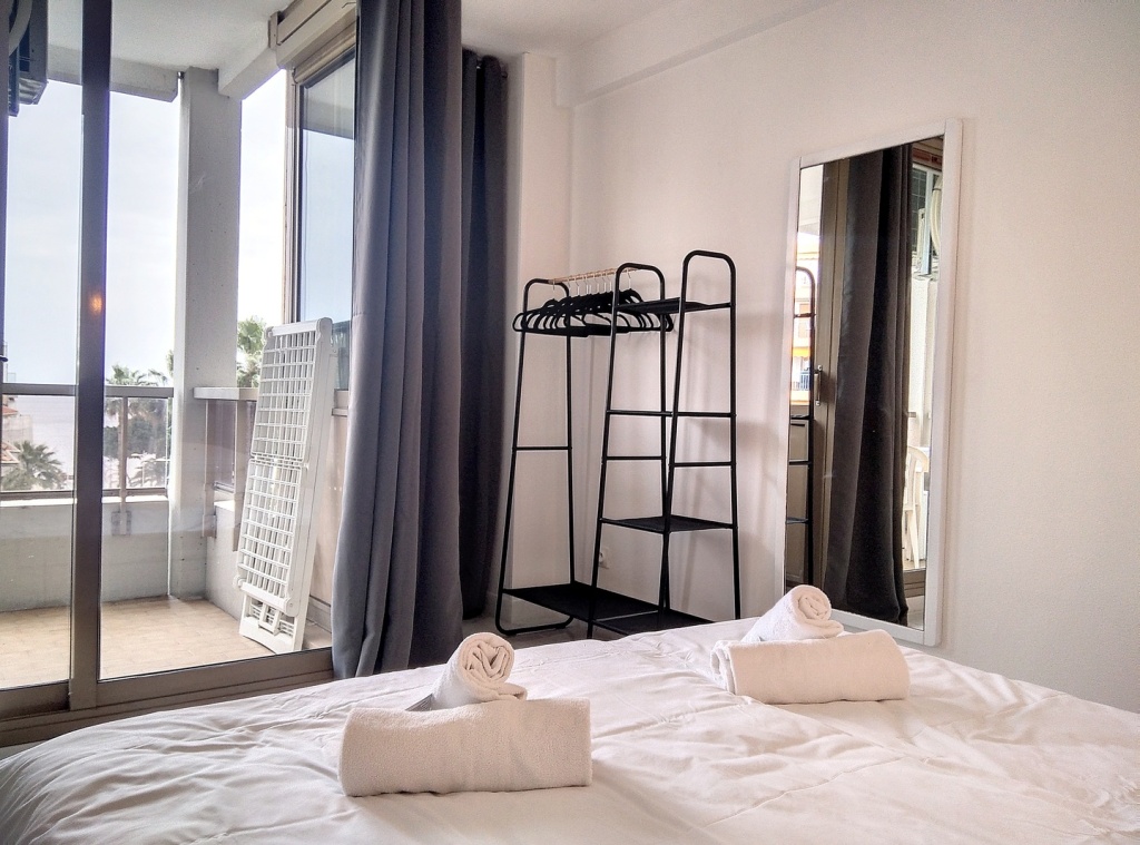 Cet appartement de 36 m2 rénové offre un bel espace dans la pièce de vie principale avec vue sur la mer.