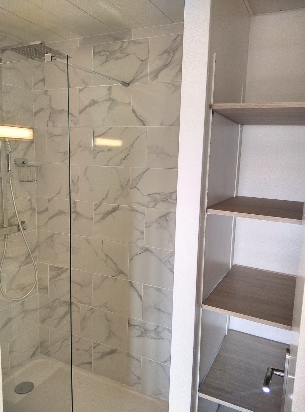La salle d'eau est équipée d'une douche et d'une machine à laver