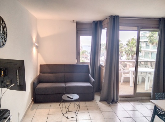 Le salon/salle à manger est équipé d'un canapé lit 2 places, table et chaises, rangements TV, Wifi, Climatisation
