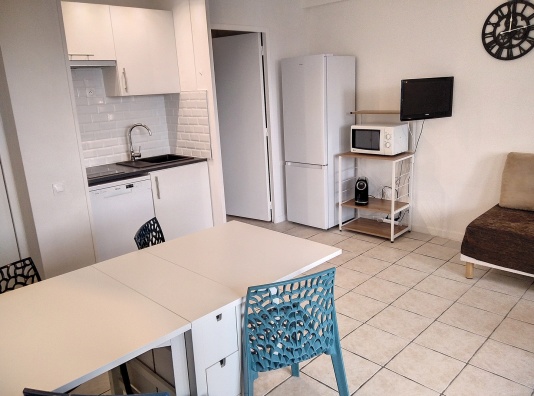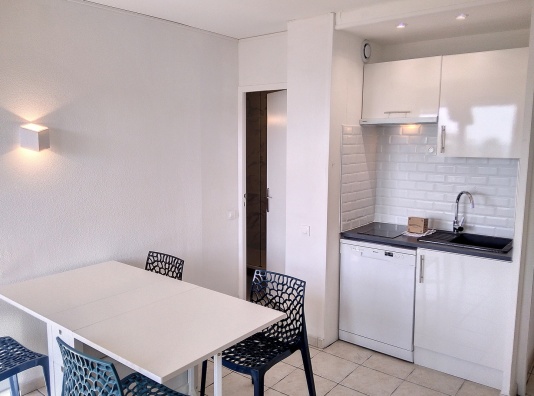 La kitchenette est entièrement équipée (plaques de cuisson, lave vaisselle, nécéssaire pour cuisiner).