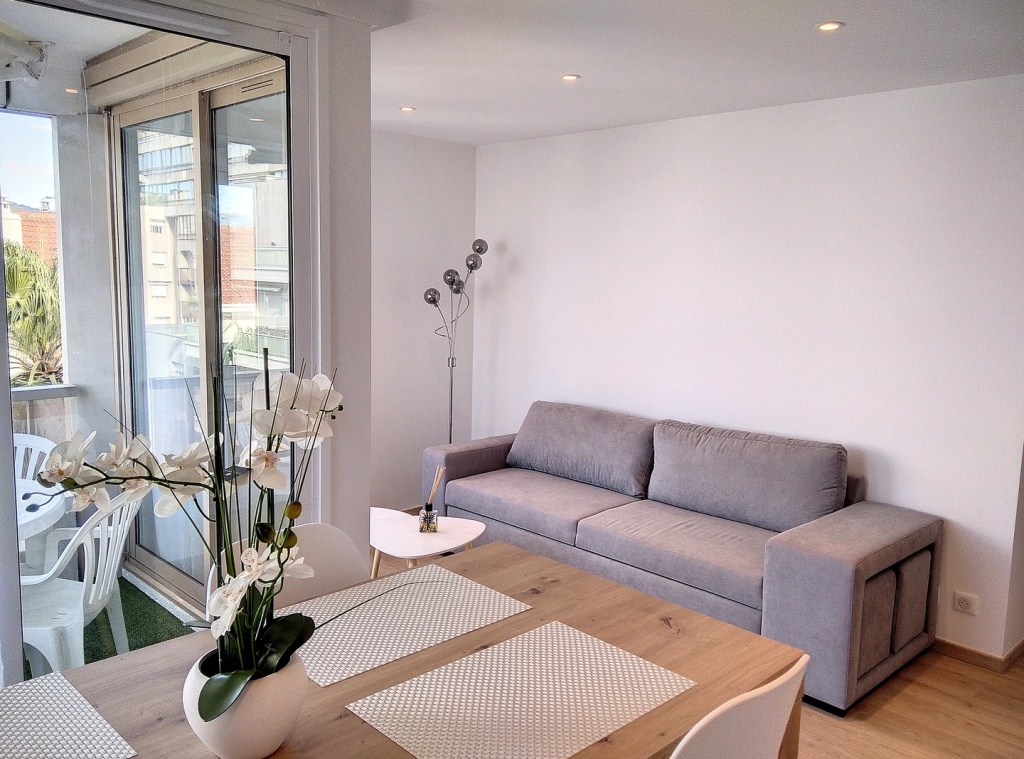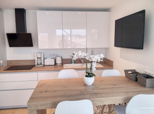 Le salon/salle à manger est équipé d'un canapé lit 2 places, d'un mange debout, rangements TV, Wifi, Climatisation, et s'ouvre sur une cuisine entièrement équipée.